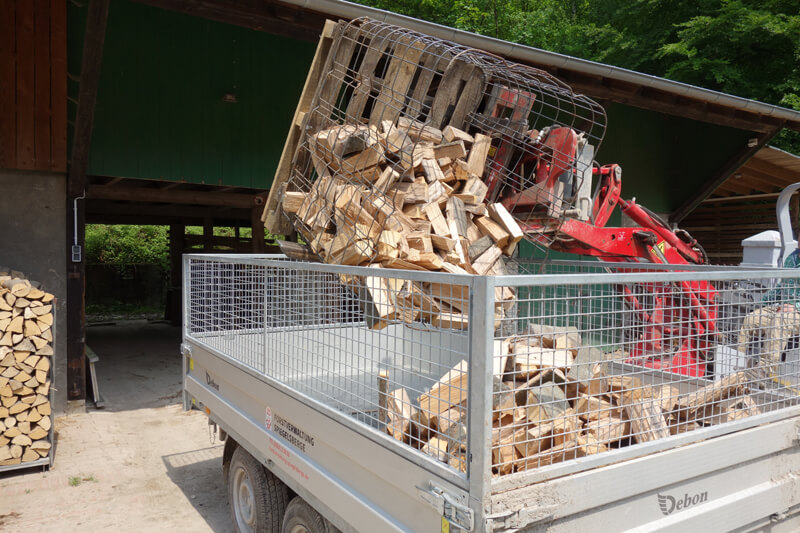 Frisch geschlagenes Holz hat eine Holzfeuchte von 60 bis 100 Prozent. Im ersten Schritt lagern wir das in Meterstücken gespaltene Brennholz im Wald aufgeschichtet. Im zweiten Schritt wird das Kaminholz auf dem Hof gesägt und in Gitterboxen gestapelt unter Dach gelagert. So erreichen wir die erwünschte Holzfeuchte von etwa 20 Prozent und haben eine sehr gute Holzqualität. Da Brennholz ein Naturprodukt ist, können Stockflecken und leichte Verfärbungen je nach Witterung nicht ausgeschlossen werden. Der Heizwert verschlechtert sich dadurch nicht.